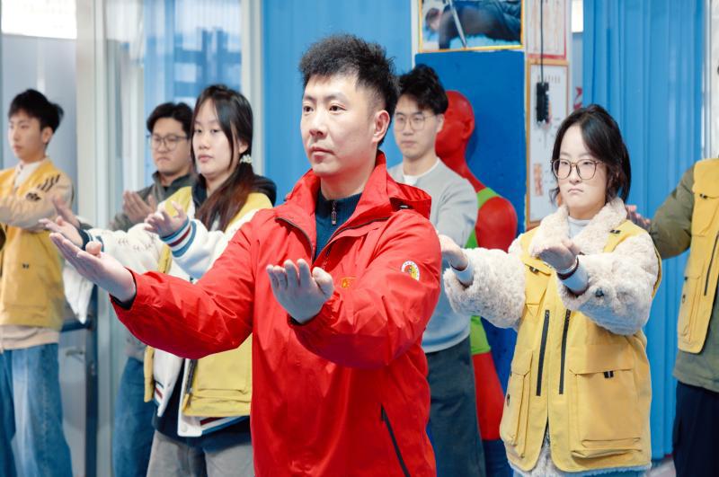 在两位传承人的指导下,实践队员们开始学习鸣鹤拳的基础手法。“练习鸣鹤拳首先要学会‘沉肩坠肘’,保持身体中正。”林老先生一边讲解,一边走到队员中间,开始逐个纠正姿势。他来到队员身边,细致调整肘部角度与身体姿态:“肘要自然下垂,这样发力才能顺畅。”林老先生的手势轻柔却有力,每一个调整都让队员们的动作更加规范,也让大家亲身感受到“口传身授”这一非遗根本传承方式的细腻与温度。