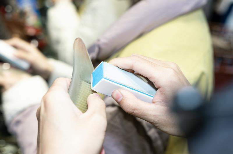 随后,队员们亲身投入打磨体验环节。大家手持砂纸与打磨工具,从粗磨到细研,亲身感受牛角材质在指尖下由粗粝渐至温润光滑的奇妙过程。每一次用力的轻重、每一道打磨的方向,都直接影响着梳齿的流畅度与梳背的弧度。在反复的研磨中,队员们不仅学习了打磨的技术要领,更真切体会到匠人对手感、力道与节奏的精微掌控。